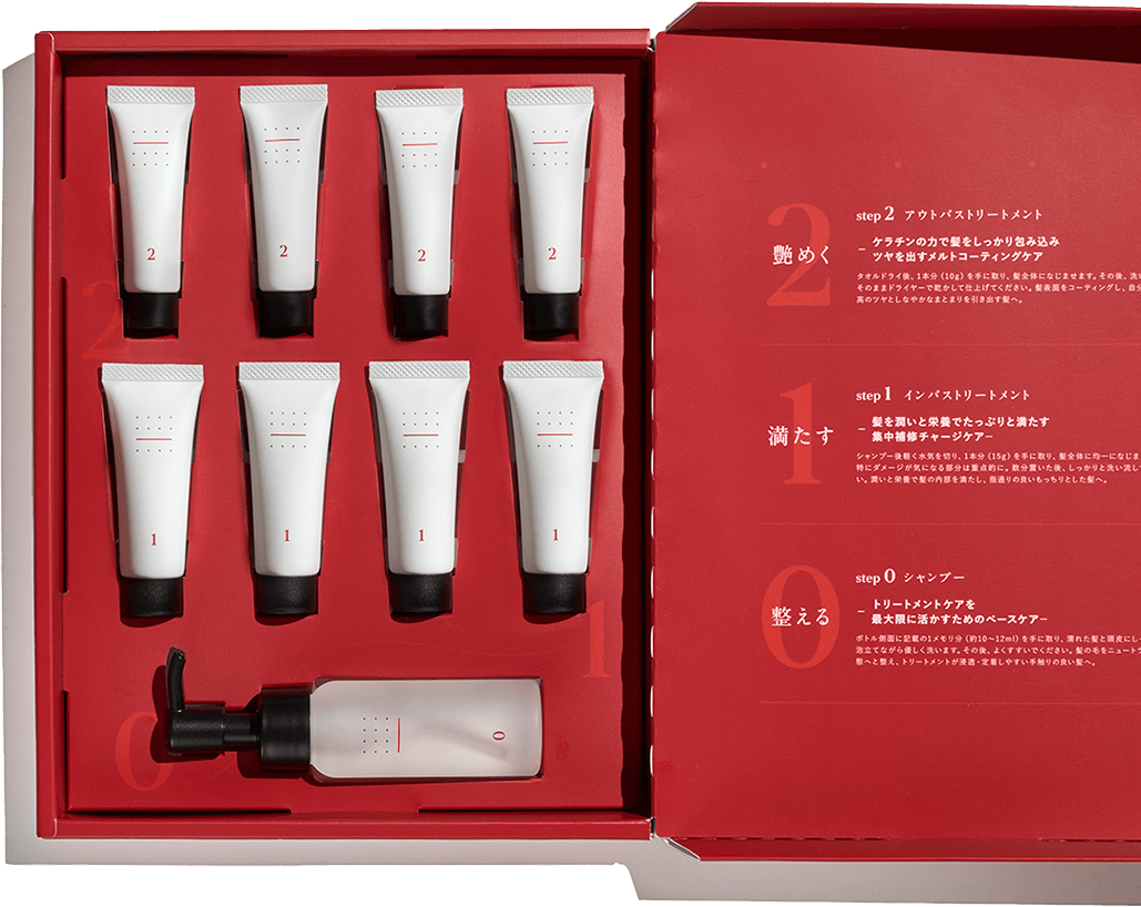 インバストリートメントにプラスイオンケラチン、アウトバストリートメントにマイナスイオンケラチンを配合することによって、それぞれが 磁石のN極とS極のように強く結びつき、水分や栄養を内側に閉じ込めながら、湿気や摩擦をブロック。